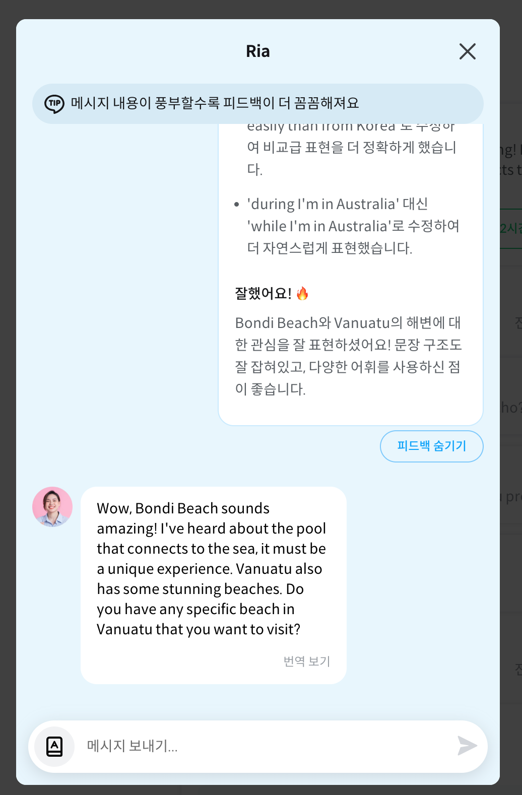 내가 한 문장에 대한 피드백도 간단명료해서 너무 좋고, 답장까지 하면서 티키타카도 되니까 은근히 좋아요. 상대의 질문에 답을 할 때는 이런식으로 하는 구나 를 알 수 있어서 너무 좋았어요