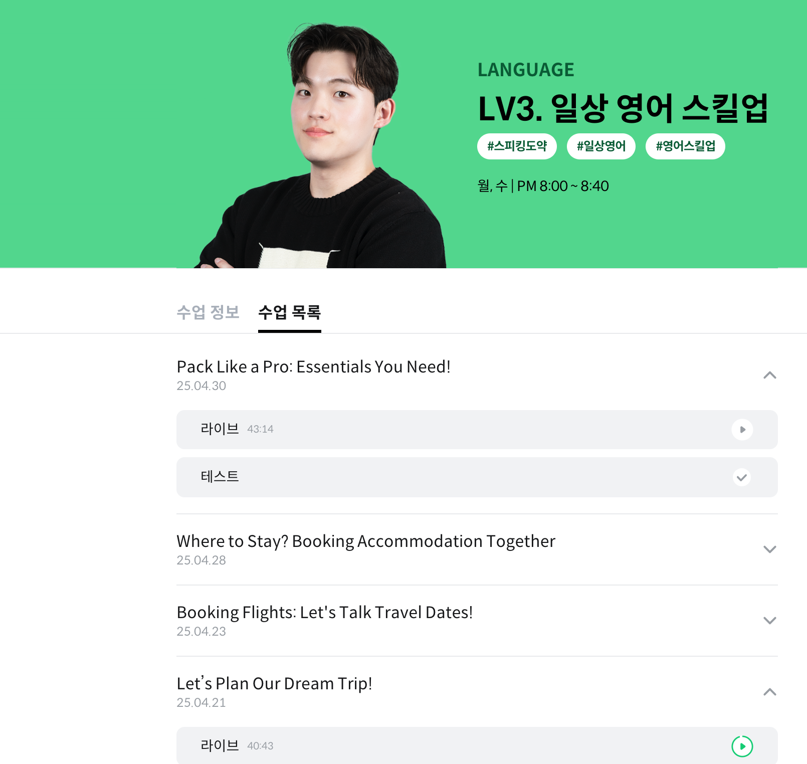 선생님 추천하자면 최근에 Kyle선생님이 새로 강의 오픈하셨는데 영어발음이 너무 현지발음이라 좋아서 듣고 있어요!