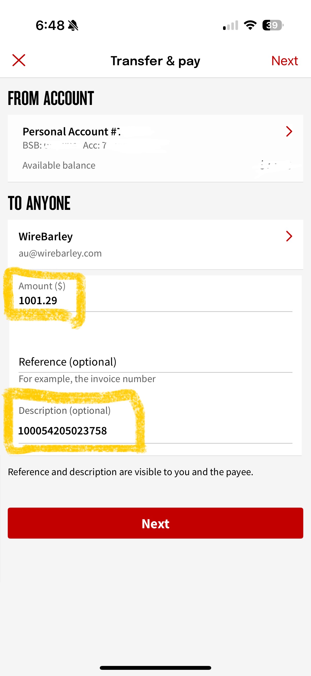 여기서 금액은 중요한 정보화면에서 적힌 수수료를 포함한 정확한 금액(1001.29)을 입력하고,